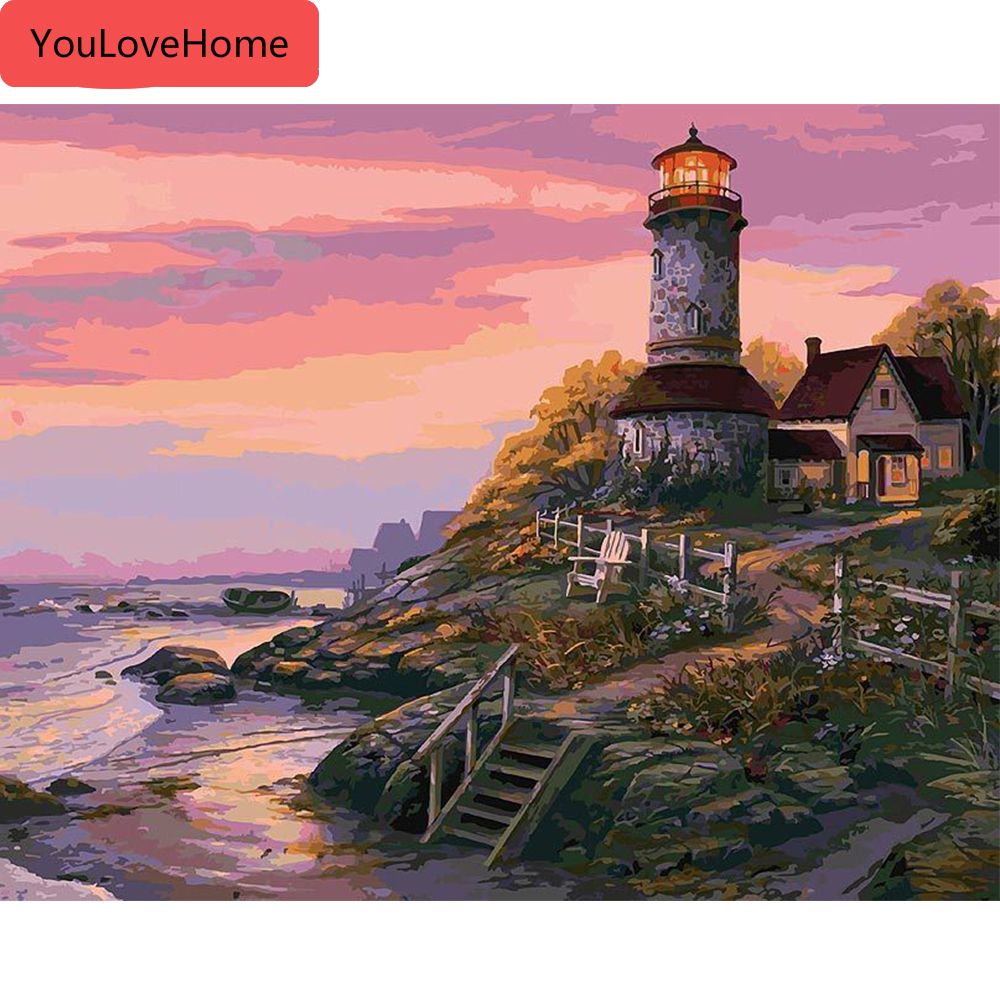 Acquista Immagini Da Numeri Pittura Di Paesaggio Kit Area Di Disegno Dipinto A Mano Olio Di Diy Da Numbers Faro La Casa A 8 6 Dal Youlovehome Dhgate Com